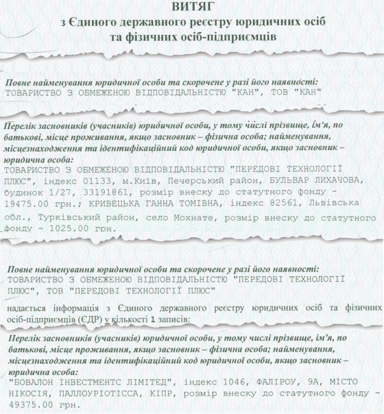 Так-от, щоб знайти іншого справжнього співвласника ТзОВ "Кан", нам довелося докласти певних зусиль, бо його ім’я ретельно було сховане за громіздкими юридичними схемами. Бо, за паперами, другий співвласник — ТзОВ "Передові технології плюс". А їх власник — ще одна компанія, цього разу із сонячного Кіпру з назвою "Bovalon invesments limited". Така собі "російська матрьошка": що далі копаєш, то більше дізнаєшся. І ось сюрприз на фініші: співвласники "Бовалона" — дві компанії Дмитра Фірташа, зареєстровані на Британських Віргінських островах, одна з них ключова компанія олігарха — "DF Group".