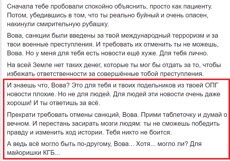 Российский финансист отметил, что ситуация стала настолько плачевной для России, что Путин начинает требовать отмены экономических санкций, однако Запад продолжит безжалостно додавливать путинскую группировку. В конце своей эмоциональной записи Рабинович обращаться напрямую к Путину, заявляя, что у него для президента России есть очень плохие новости: