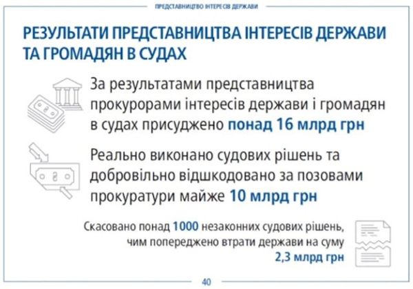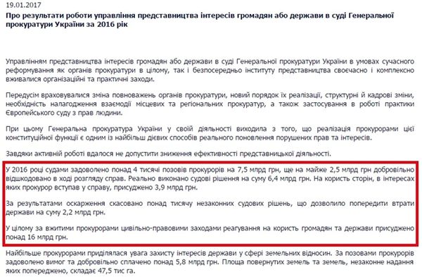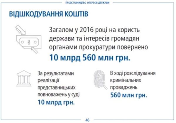 В начале 2017 года Генеральный прокурор Юрий Луценко отчитался о результатах работы прокуратуры за 2016 год посредством представительства интересов граждан и государства в суде. Сообщив, что Генпрокуратура вернула государству и гражданам более 10 млрд грн.