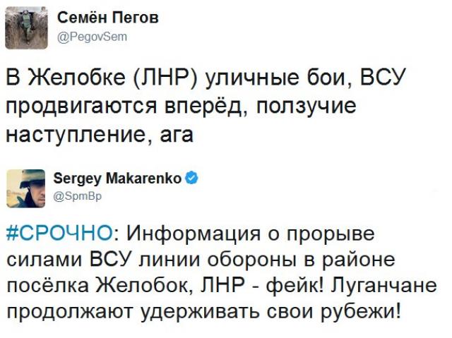 «В Желобке уличные бои. ВСУ продвигаются вперед», — пишут пропагандисты боевиков. Некоторые продолжают опровергать эту информацию, однако подобных сообщений все больше.