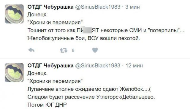 «Луганчане вполне ожидаемо сдают Желобок… Следом будет рассечение Углегорск/Дебальцево… Потом юг „ДНР“», — прогнозирует боевик под ником «Сириус Блек».