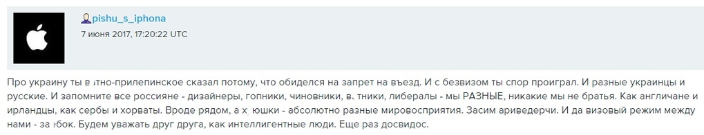 "Про Украину ты в*тно-прилепинское сказал, потому что обиделся на запрет на въезд. И с безвизом ты спор проиграл. И разные украинцы и русские. И запомните: все россияне - дизайнеры, гопники, чиновники, в*тники, либералы - мы разные, никакие мы не братья. Как англичане и ирландцы, как сербы и хорваты. Вроде рядом, а х*юшки - абсолютно разные мировосприятия. Засим ариведерчи. И да визовый режим между нами - за*бок. Будем уважать друг друга, как интеллигентные люди", - отметил один из комментаторов.