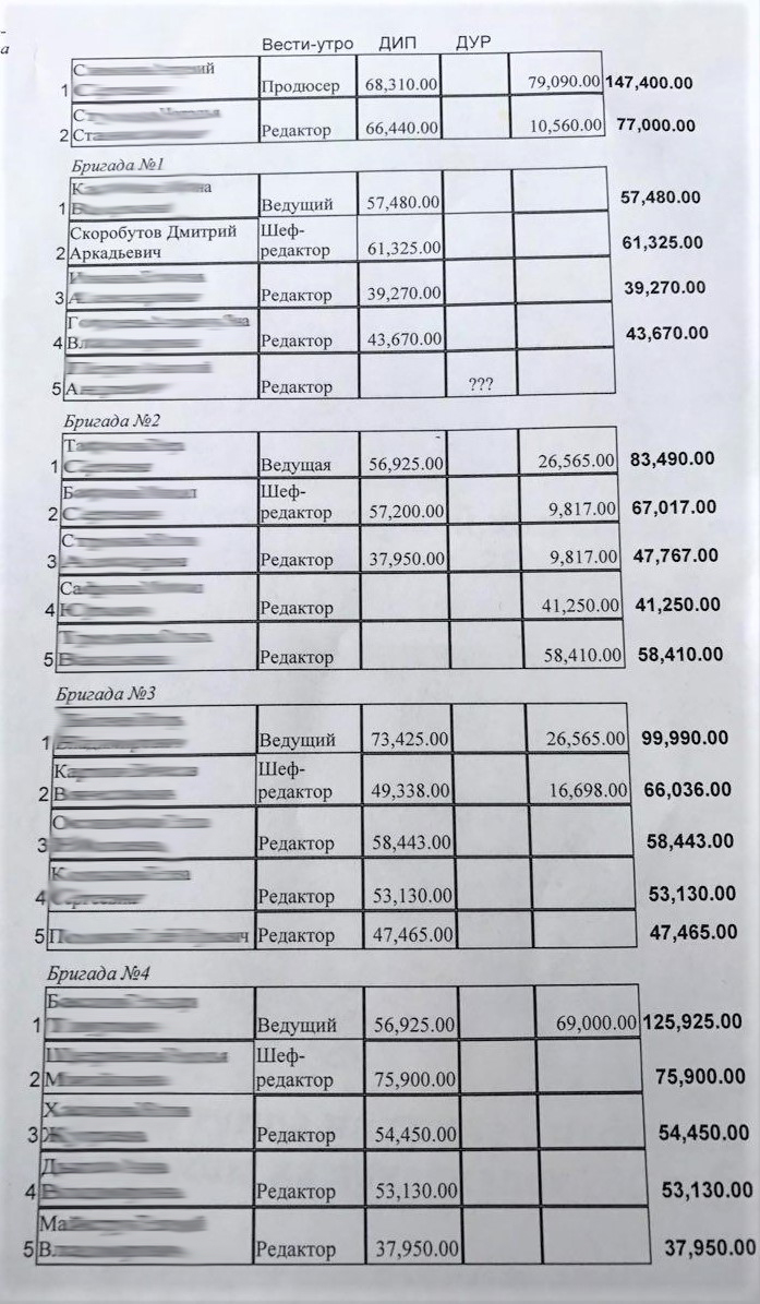 Но далеко не все хорошо зарабатывают. У меня и моих сотрудников были смешные зарплаты. На руки я получал 57 тысяч, из которых оклад по контракту – 8 600. Мои редакторы, девочки, за которых я бился, около 40 тысяч на руки. Был скандал, когда я пошел к Жене Ревенко (бывший директор «Вестей»), говорю: «Евгений Васильевич, вот такая ситуация: одна моя сотрудница – мать-одиночка, вторая – молодая семейная девочка, зарплаты 35 тысяч. Как вы считаете, это нормально?». С большим трудом он прибавил по 5 тысяч. Конечно, за это я получил по голове – истерику устроила так называемая «куратор» утренних выпусков Саша Воронченко: «Да как ты мог?! Да кто ты такой?! Да в обход меня!» Отвечаю ей: «у тебя люди по 10 лет и копейки лишней не видели, а тут 5 тысяч…» И люди за такие деньги работают. Дежурная у эскалатора в метро получает столько же, а мы делали федеральные выпуски «Вестей».