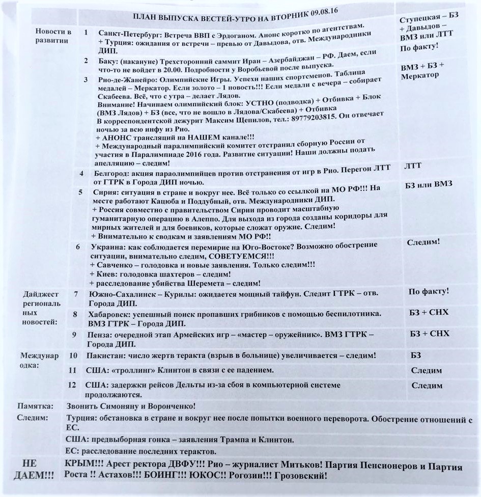 Обычно за несколько часов до эфира согласовывался план выпуска, в котором все расписано: что даем, что нет. В том числе и по персоналиям. В плане есть такая строчка «не даём» или, как ее гениально «зашифровала» Саша Воронченко, «НД». Почему-то в неё попадали какие-то фигуры даже из власти. Бастрыкин был, Астахов, Жириновский почему-то. Кого только не было. Я не спрашивал, почему.