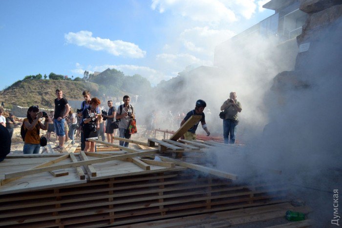 Как сообщает Думская, одесситы подожгли строительный лес, выбросили в бассейн емкости с песком и приступили к демонтажу металлического каркаса на песке. Также активисты планируют снести пристройки из гипсокартона.