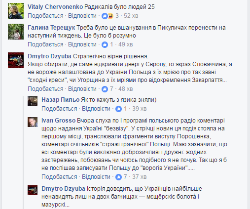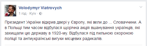 "Президент Украины открыл дверь в Европу, которые вели в ... Словакию. А в Польше тем временем состоялась ежегодная акция чествования украинцев, которые защищали эту страну в 1920 году. Состоялась под бдительной охраной полиции и антиукраинские выкрики местных радикалов", - написал он.