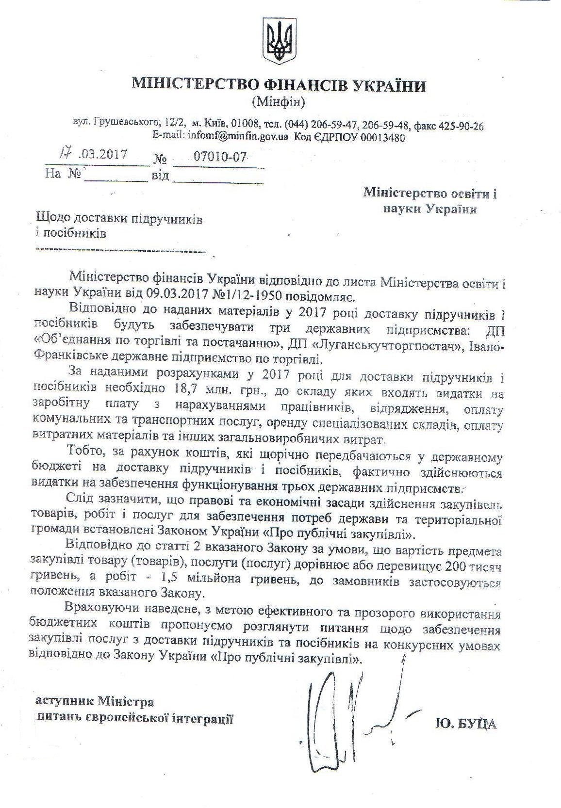 "То есть, за счет средств, которые ежегодно выделяются в государственном бюджете на доставку учебников и пособий, фактически осуществляются расходы на содержание трех госпредприятий", - отметил в письме в Минобразования замминистра финансов Юрий Буца.
