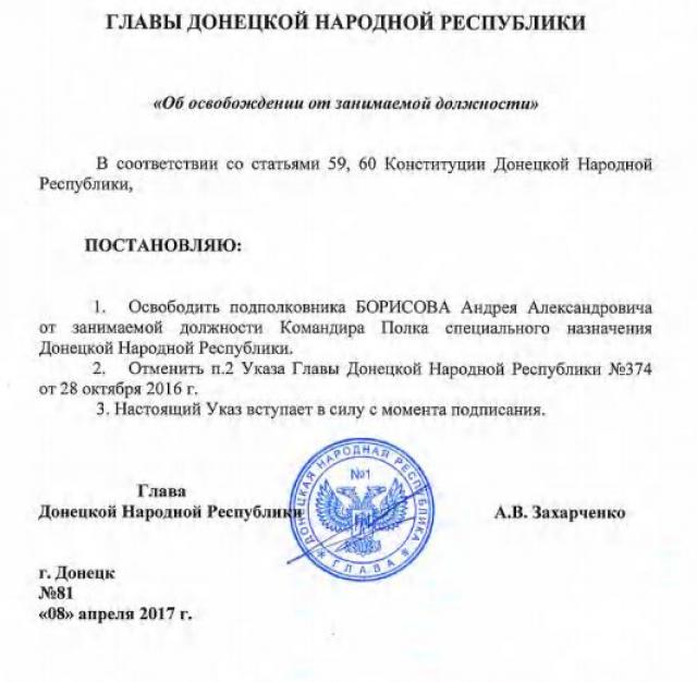 Согласно указу главаря «ДНР» Александра Захарченко, Андрей Борисов с позывным «Чечен» больше не возглавляет «полк спецназначения ДНР», теперь на его место назначен Евгений Ряднов.