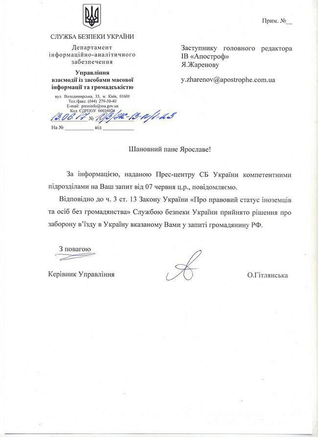 "Согласно ч.3 ст.13 Закона Украины "О правовом статусе иностранцев и лиц без гражданства", Службой безопасности Украины принято решение относительно запрета въезда в Украину указанному вами в запросе гражданину РФ", - говорится в тексте документа.