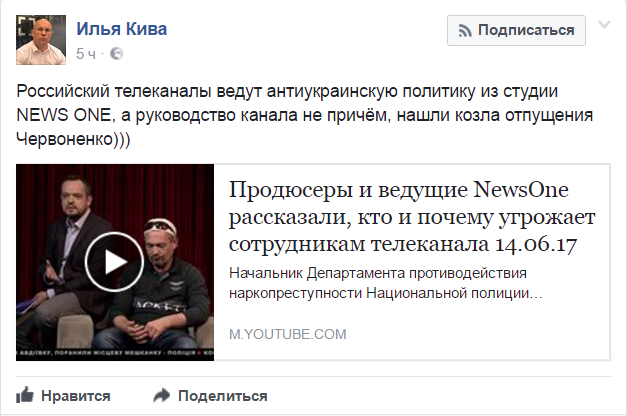 Он призвал СБУ провести расследование по факту пособничества агрессору, а также обратился к патриотам с призывом "заткнуть рот кремлевской пропаганде, которая вещает через ватный канал NewsOne".