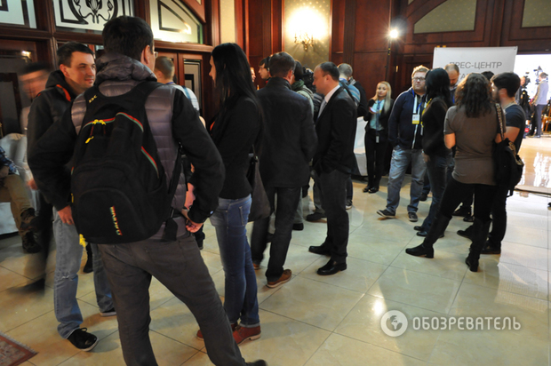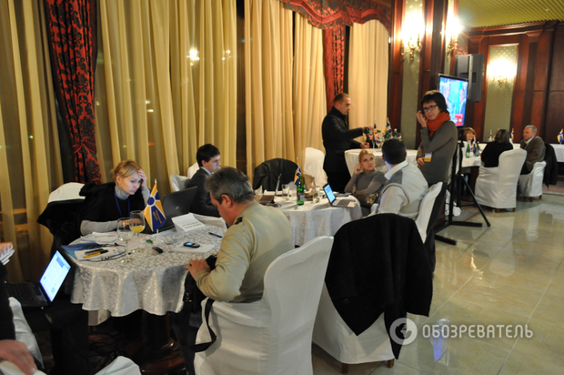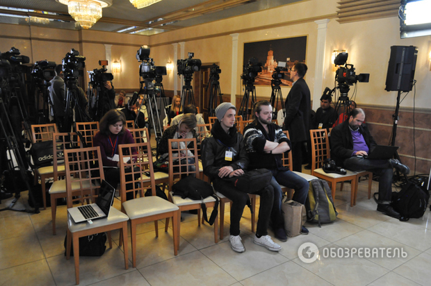 В перерывах между немногочисленными вечерними брифингами журналисты откровенно скучали. Кто-то дремал, кто-то с головой окунулся в просторы Интернета, кто-то смаковал нехитрое угощение от "Народного фронта": сок, воду и горстку пирожков.