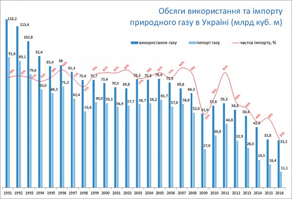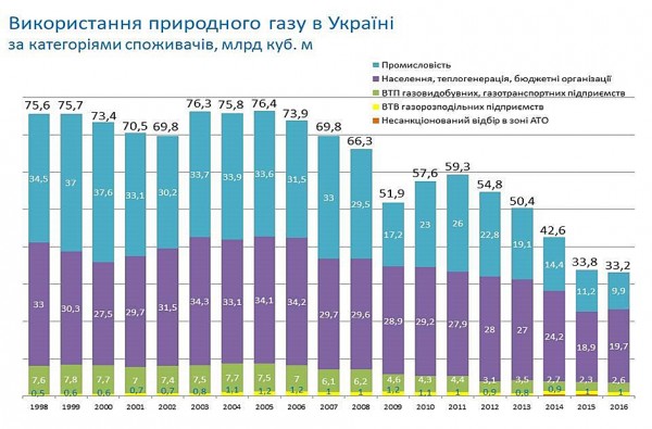 Потребление природного газа в государстве сокращается с 2005 года. В противовес тогдашним рекордным 76,4 млрд куб. м в 2013-м году украинцы использовали, по данным НАК «Нафтогаз Украины», только 50,4 млрд куб. м. А с началом войны и постепенным расторжением экономических отношений с Россией, которая до 2014 года была единственным поставщиком газа в Украину, этот процесс пошел быстрее. В конце ноября 2015 года НАК «Нафтогаз Украины» прекратил покупать голубое топливо у российского Газпрома.