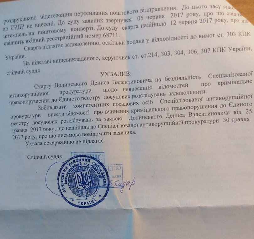 Своим решением Печерский суд Киева обязал САП безотлагательно открыть уголовное производство и внести сведения в ЕРДР в отношении народного депутата от "Народного фронта" Сергея Пашинского, заместителя министра юстиции Павла Мороза, бывшего начальника Управления полиции в Житомирской области Валерия Рудика и еще нескольких чиновников.