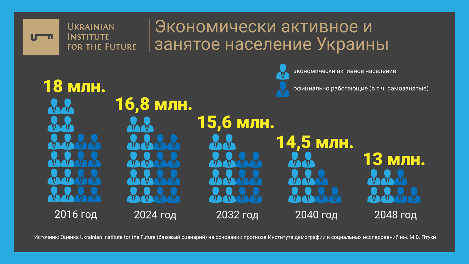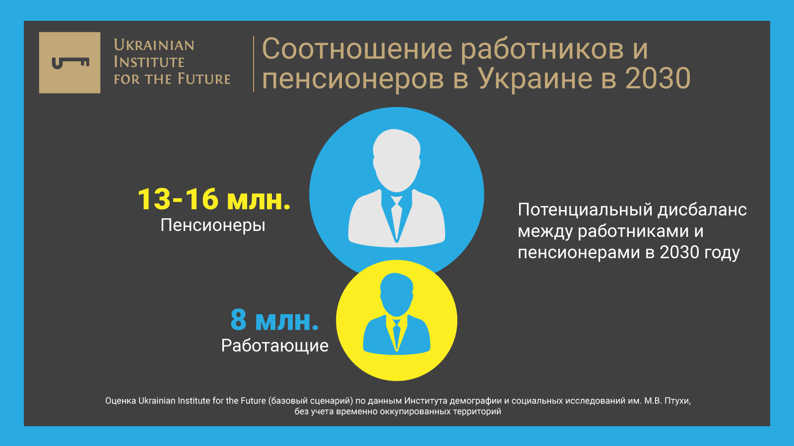 Якщо нічого не робити, дисбаланс між працюючими та пенсіонерами буде критичний. Реальне кількість працівників у формальному секторі економіки може знизитися до 8-10 млн. осіб. У той же час кількість пенсіонерів збільшиться до 13-16 млн. осіб.