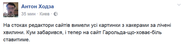 "На стоках редакторы сайтов вымели все картинки с хакерами за считанные минуты. Кум замешкался, и теперь на сайт Гарольда что-прячет-боль ставит", - пишет блогер Антон Ходза.