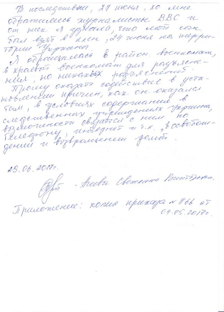 В последствии, 27 июня, ко мне обратились журналисты ВВС и от них я узнала, что мой сын был взят в плен, 24 июня на территории Украины.