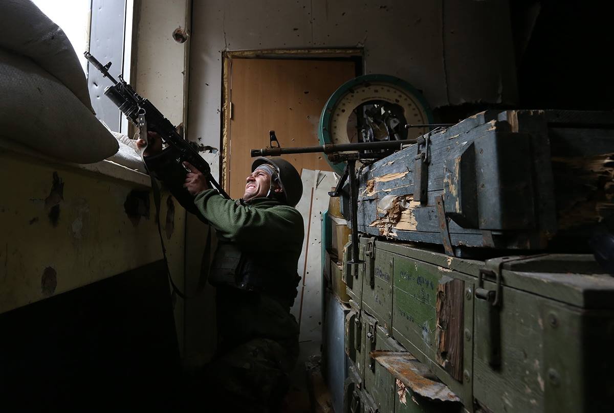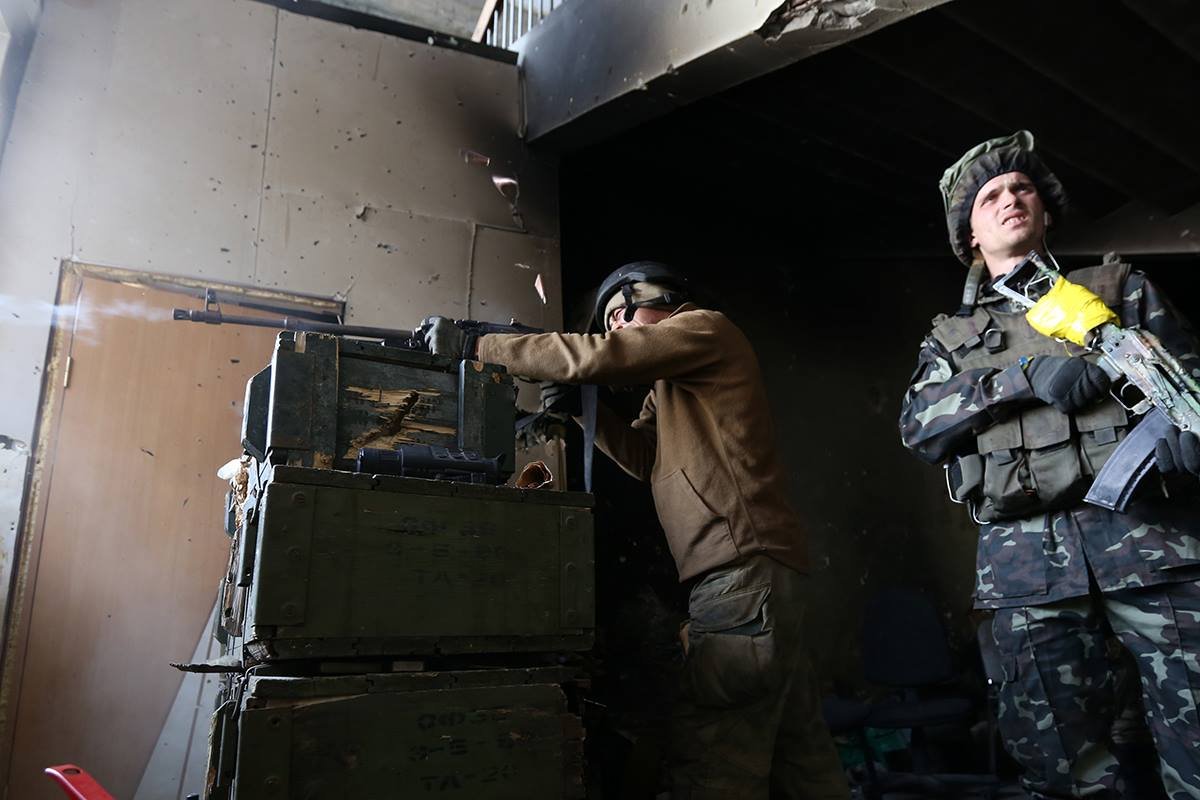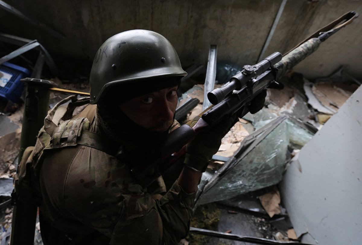 Украинский доброволец из Правого Сектора Валерий Чудновский ведет бой на окраине Донецкого Аэропорта.