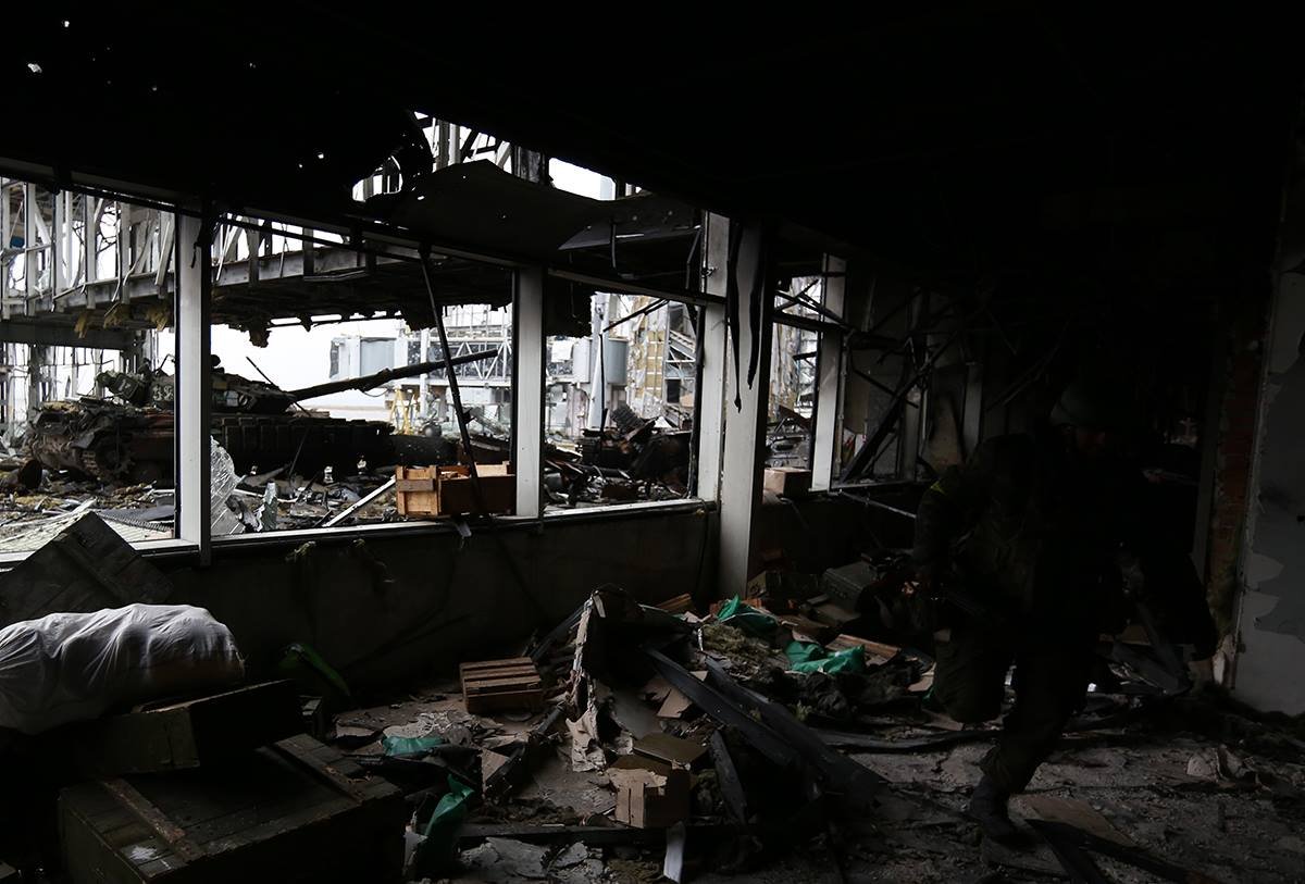 Украинский солдат бежит в укрытие во время перестрелки в Новом Терминале Донецкого Аэропорта.