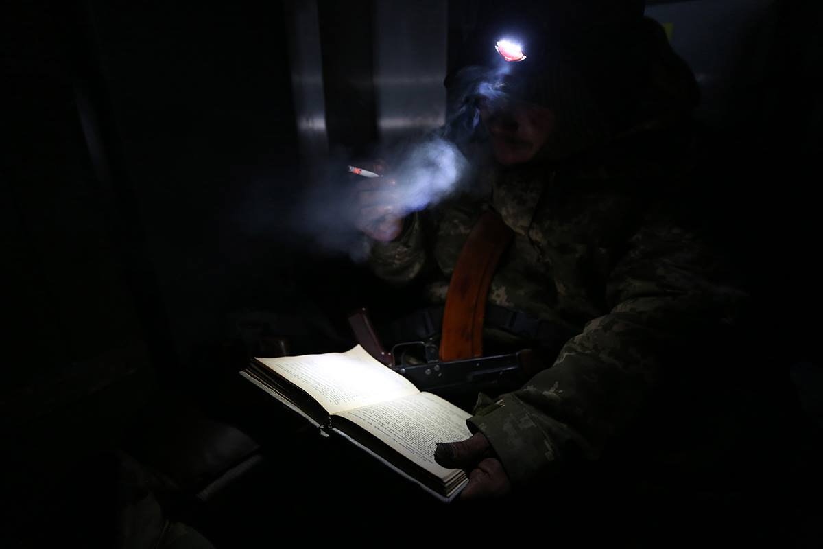 Украинский солдат читает книгу во время затишья между боями в Донецком Аэропорту.
