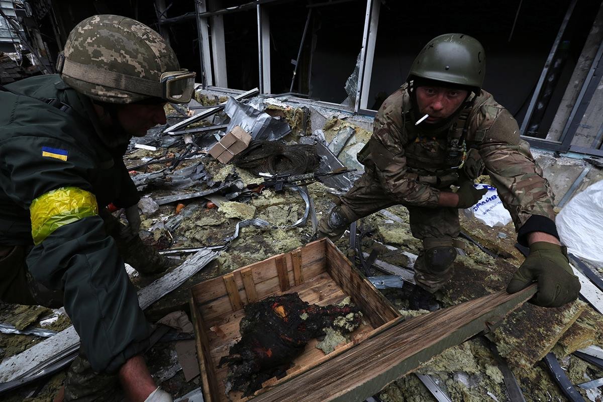 Cлавик и Миша под огнем противника готовят останки сгоревшенго танкиста к отправке домой из Донецкого Аэропорта.