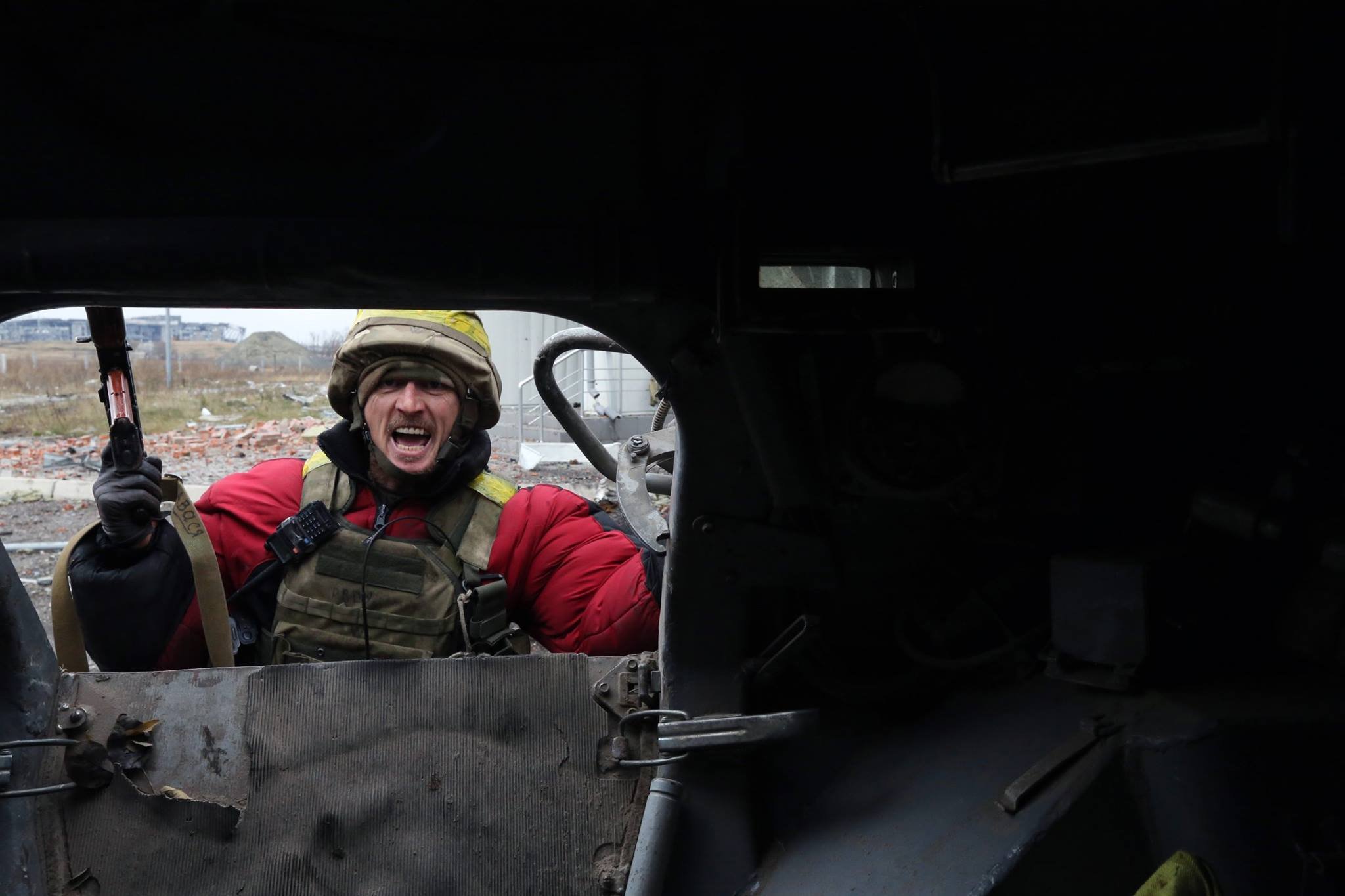 Украинский солдат кричит что-то в люк бронетранспортера во время боя в Донецком Аэропорту.