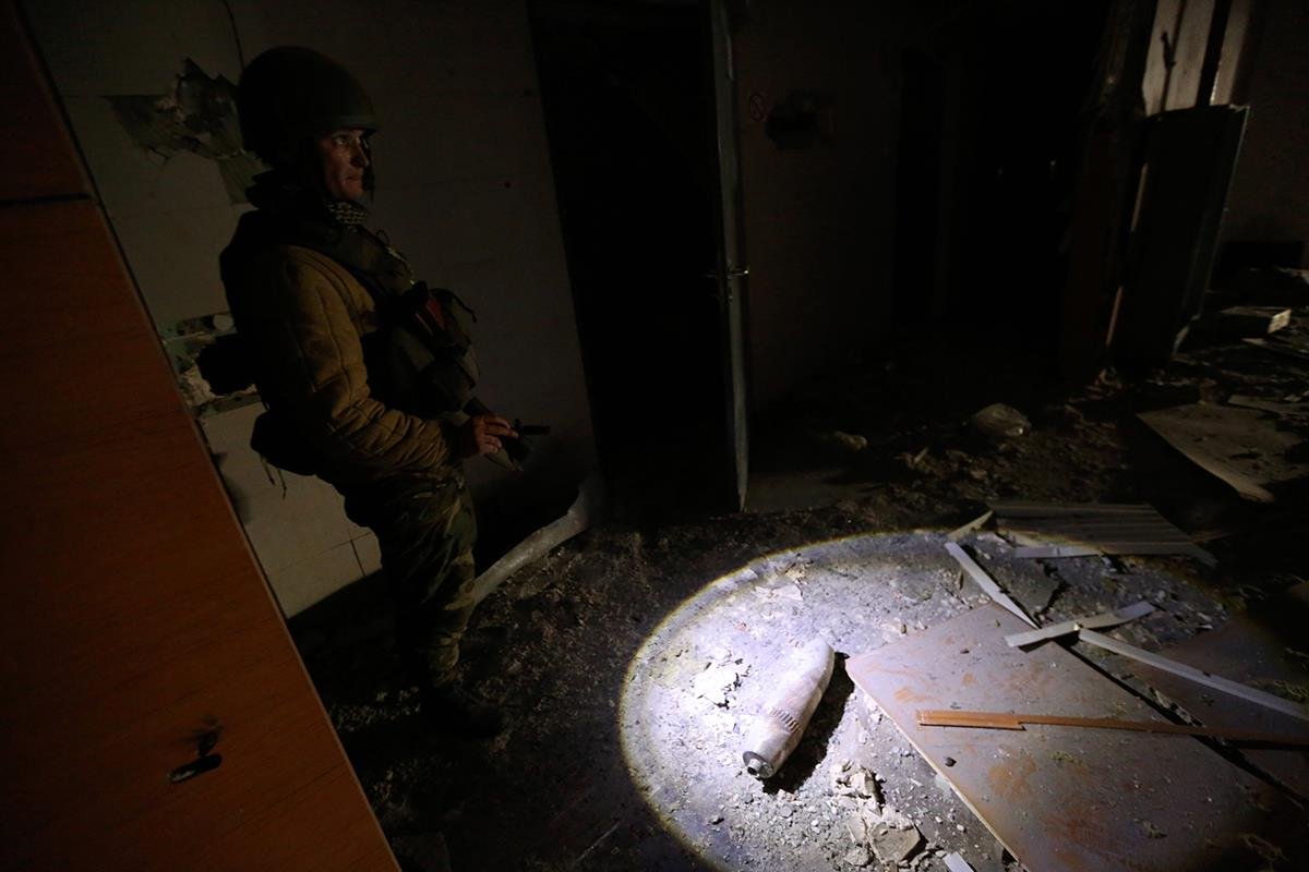 Майор минер Валерий Рудь перед неразорвавшимся снарядом в Новом Терминале Донецкого Аэропорта.