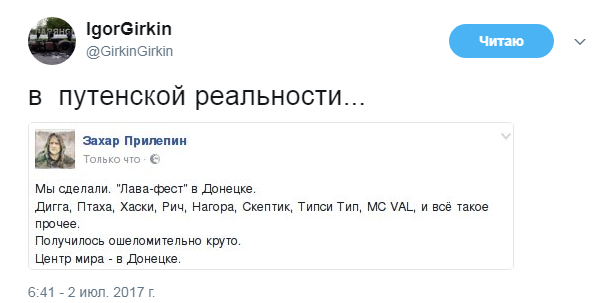 "Мы сделали. "Лава-фест" в Донецке. Дигга, Птаха, Хаски, Рич, Нагора, Скептик, Типси Тип, MC VAL, и всё такое прочее. Получилось ошеломительно круто. Центр мира - в Донецке", - написал террорист.