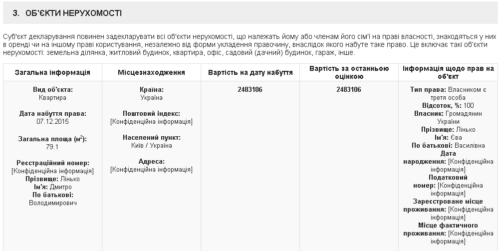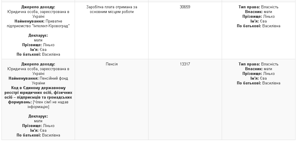 А в конце 2015 года, согласно электронной декларации, на имя матери нардепа Евы Линько была приобретена квартира в Киеве площадью 79 кв. м стоимостью почти 2,5 миллиона гривен. Причем до этого у нее уже была квартира в Кропивницком (бывшем Кировограде):