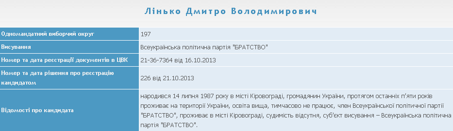 На довыборах в Раду в 2013 году Дмитрий Линько выдвигался в депутаты по кировоградскому округу № 197 от партии "Братство" Дмитрия Корчинского: