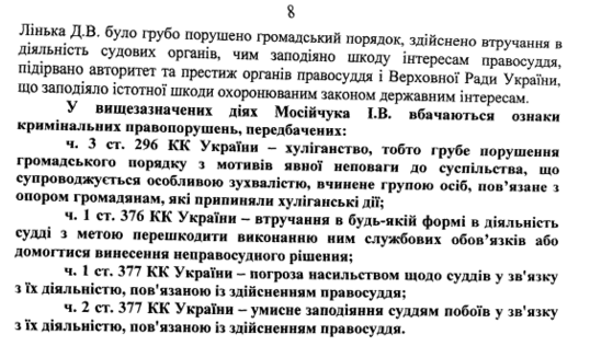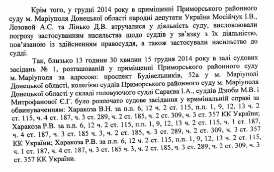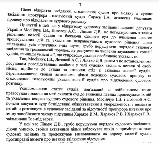 Как сообщается в документе, нардепы, среди которых был и Линько, вместе с другими неустановленными лицами в зале судебных заседаний встали и окружили стол с составом коллегии судей, мешая своими активными действиями ведению судебного процесса. Мосийчук и Лозовой начали выдвигать суда безосновательные обвинения в предвзятости и требовать немедленно рассмотреть в судебном заседании в отсутствие прокурора вопрос об изменении меры пресечения подсудимым. В это время Линько заблокировал выход из помещения зала судебных заседаний и высказывал в адрес судей противоправные требования о немедленном освобождении подсудимых.