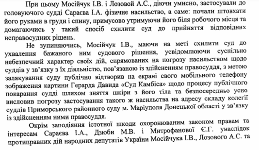 При этом, как значится в документе, Мосийчук и Лозовой начали толкать председательствующего судью в грудь и спину, удерживая его у рабочего места. Кроме того, Мосийчук на экране телефона показал судьям картину "Суд Камбиса", на которой сдирают кожу с человека и пригрозил тем самым судьям.