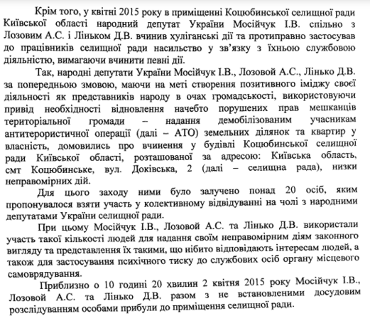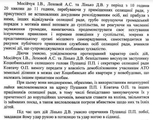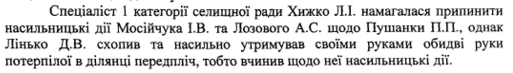 "Во время этих действий Линько Д.В. умышленно нанес побои заместителю поселкового головы Пушанке П.П., причинив ему удар рукой в затылок и удар ногой в ягодицы". Кроме того, по версии документа, Линько схватил и насильно удерживал работницу сельсовета, которая хотела заступиться за Пушанку: