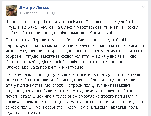 "Увы, реакция полиции была довольно вялой, и только два патруля выехали на место. Мои попытки и попытки полиции остановить и уговорить "титушек" были безуспешными. Нападавшие атаковали, применяя оружие", - написал Линько. При этом он отметил, что сообщения об опасной ситуации поступали в полицию постоянно на протяжении 12 часов до начала конфликта.