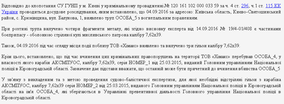 Как выяснили следователи, в собственности "ОСОБА_4" находится карабин "АКСМПУОС" такого же калибра 7,62х39. Разрешение на это оружие выдано в марте 2015 года Главным управлением Национальной полиции в Кировоградской области. Согласно версии следствия, это дает основания считать, что данный гражданин может быть причастен к совершению убийства:
