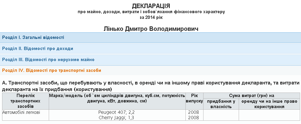 Однако в 2014 году у него откуда-то взялась машина Peugeot 407, вдобавок к уже имевшемуся дешевому "китайцу" Cherry. Ни источники средств, ни стоимость машин в декларациях не указаны:
