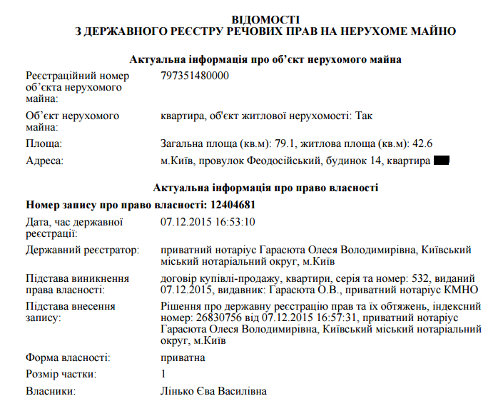 "Страна" получила выписку из реестра недвижимости на киевскую квартиру матери Линько. Оказалось, что эта квартира находится в доме на Феодосийском переулке, недалеко от станций метро "Выдубичи", "Димеевка" и центра столицы: