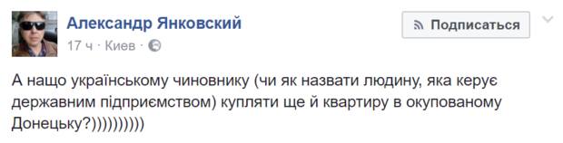 "А зачем украинскому чиновнику (или как назвать человека, который руководит государственным предприятием) покупать еще и квартиру в оккупированном Донецке?" – пишет блогер Александр Янковский.