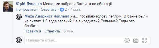 Проте,  мабуть, на інформацію від Олени Тищенко і коменти в соцмережах, в тому сенсі, що, скоріш за все, конфісковані були облігації внутрішньої позики, жваво відреагував  пан Луценко, який звертаючись у Фейсбуці до Михайла Чаплиги  наголосив, - “Міша, ми забрали бакси, а не облігації.”