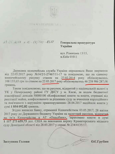 З цього листа, підписаного  заступником Голови ДКСУ Грубіяном (це прізвище), ми можемо  дізнатися, що той самий конфіскований мільярд доларів, насправді, з Ощадбанку нікуди не дівся, а продовжує там і далі знаходитися, незважаючи на гучні заяви  пана Луценка про те, що, типу, йес, ми це зробили і мегаісторичне селфі  ГенплокуЛОЛа разом з Андрієм Пишним і Олександром Турчиновим.