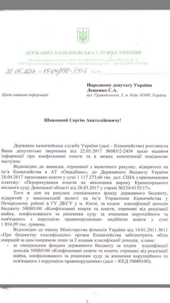 Проте, операція з прикриття багатомільярдної афери влади продовжилася і до неї підключилася Державна казначейська служба України, яка порадувала листом до ГПУ щодо зарахувань конфіскованих за рішенням Краматорського суду коштів до Держбюджету.