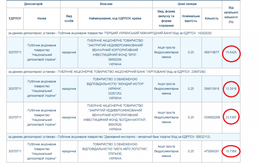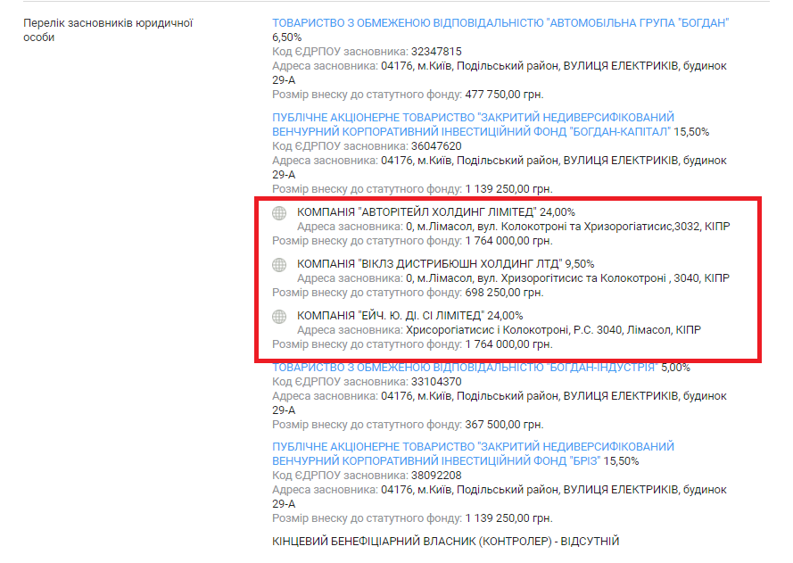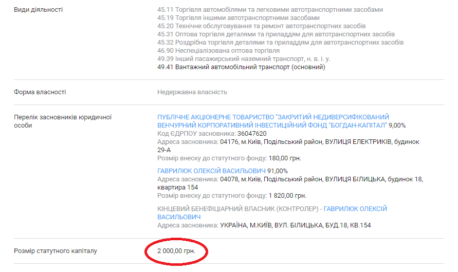 Почти 11% акций принадлежит ООО "Мега авто логистик", среди учредителей которого все тот же ПАО "Закрытый недиверсифицированный венчурный корпоративный фонд "Богдан-капитал". Уставной капитал держателя акций такой внушительной корпорации всего 2 тысячи гривен.