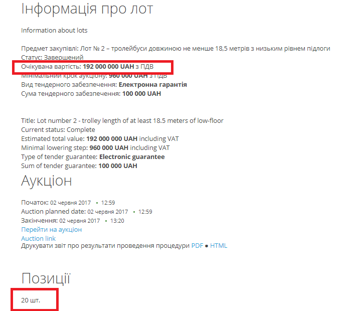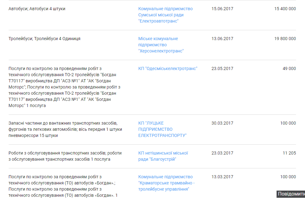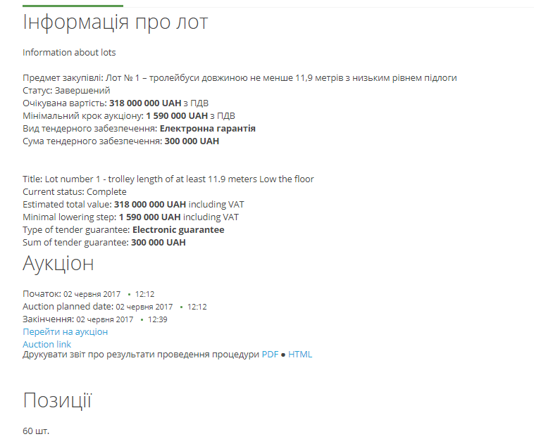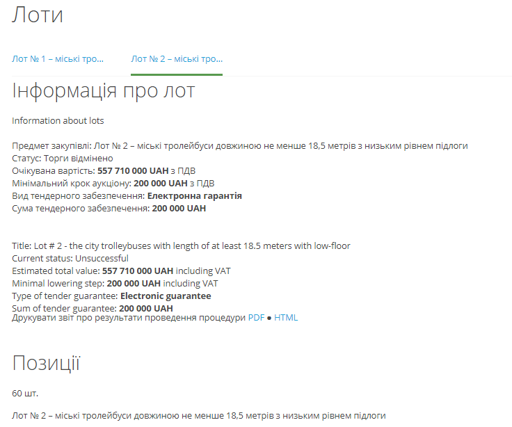 Один из последних тендеров был проведен весной этого года. Заявленная сумма поражала - более полумиллиарда гривен, которые разбили на два лота. Согласно условиям первого лота, коммунальное предприятие предлагало 318 миллионов гривен за 60 троллейбусов, которые победитель должен поставить до 29 декабря 2017 года.