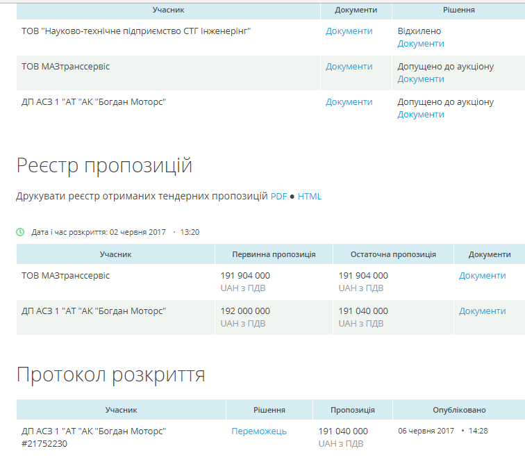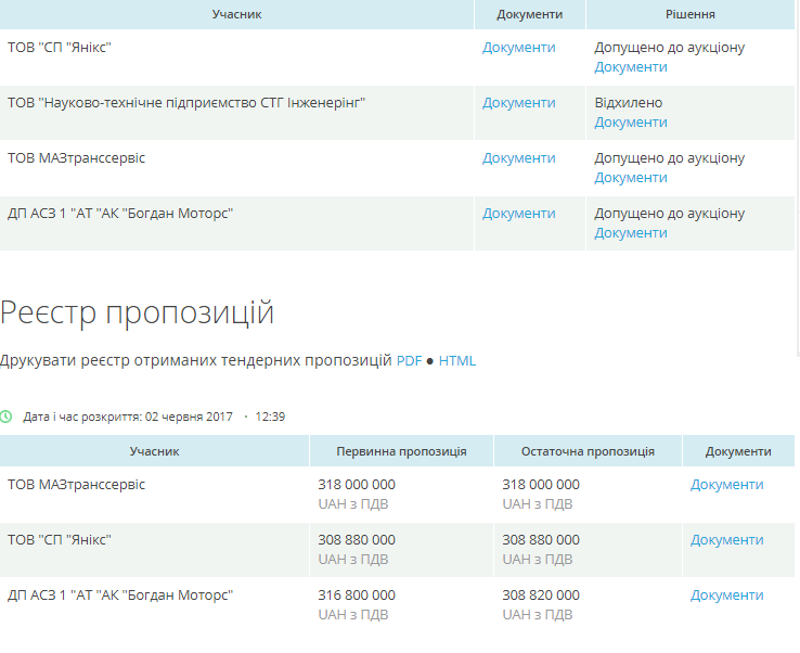 На торги подались три компании: уже знакомое дочернее предприятие "Автоскладальный завод №1" корпорации "Богдан", ООО "Укрпастех" и ООО "Научно-техническое предприятие СТГ Инженеринг", предложение которого вновь отклонили, хотя данная компания и готова была поставить автобусы дешевле всех - за 180 миллионов гривен.