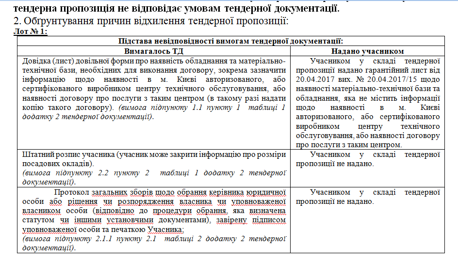 На аукцион подались аж четыре компании. Одну из них - ООО "Научно-техническое предприятие СТГ Инженеринг" - к торгам не допустили. Как указано в документе, участник предоставил гарантийное письмо о материально-технической базе и оборудовании, которое не содержало информации о наличии в Киеве авторизованного либо сертифицированного центра техобслуживания, либо наличие договора об услугах с таким центром.