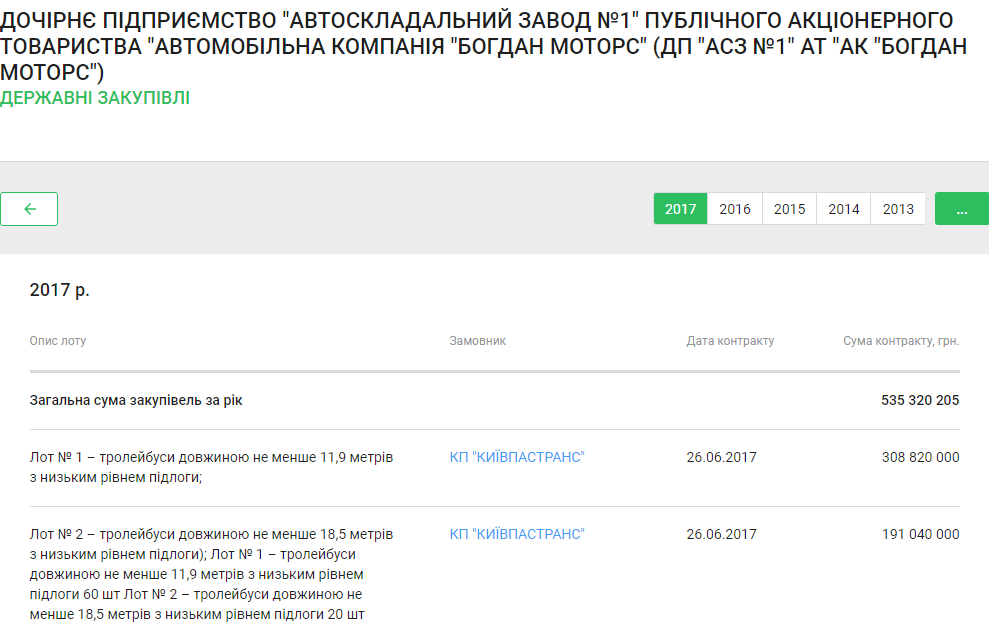 В прошлом году завод из орбиты корпорации "Богдан" также выиграл крупный тендер на закупку автобусов в Киеве. Так, КП "Киевпастранс" объявил торги на более, чем 480 миллионов гривен, вновь разбив тендер на два лота.