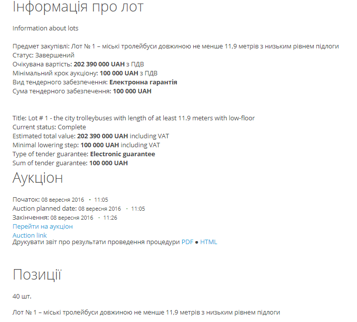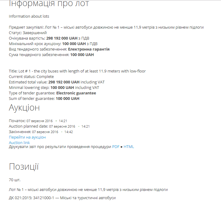 В первом лоте предлагалось 298,192 миллиона гривен за 70 городских низкопольных автобусов. На аукцион подались две связанные между собой фирмы - дочернее предприятие "Автоскладальный завод №1" компании "Богдан" и ООО "МАЗтранссервис". В этом тендере победила фирма "МАЗтранссервис" с предложением 290,22 миллиона гривен. Снижение цены в тендере составило менее семи миллионов гривен, а цена одного автобуса превысила 4,1 миллион гривен.