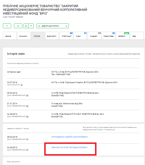 Так, более 15% акций компании принадлежит ПАО "Закрытый недиверсифицированный венчурный корпоративный инвестиционный фонд "Бриз", в котором Олег Свинарчук с момента основания (2012 год) до февраля 2015 года значился руководителем.