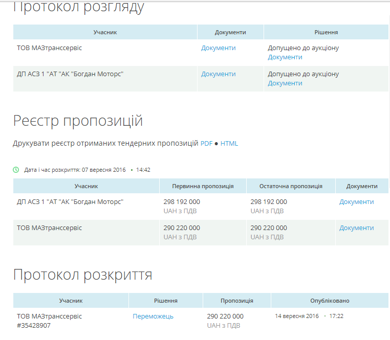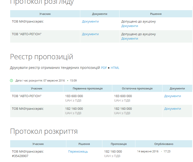 Лакомый "кусок" бюджетных денег захотели две компании - ООО "МАЗтранссервис" и ООО "Авто-регион". С предложением 182,16 миллионов гривен победила фирма "МАЗтранссервис", которая оказалась связана со своим "конкурентом" на данных торгах.