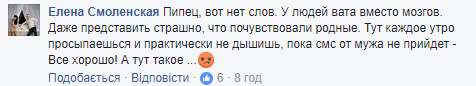 "Вот нет слов. У людей вата вместо мозгов. Даже представить страшно, что почувствовали родные. Тут каждое утро просыпаешься и практически не дышишь, пока смс от мужа не прийдет - Все хорошо! А тут такое", - написала Елена Смоленская.