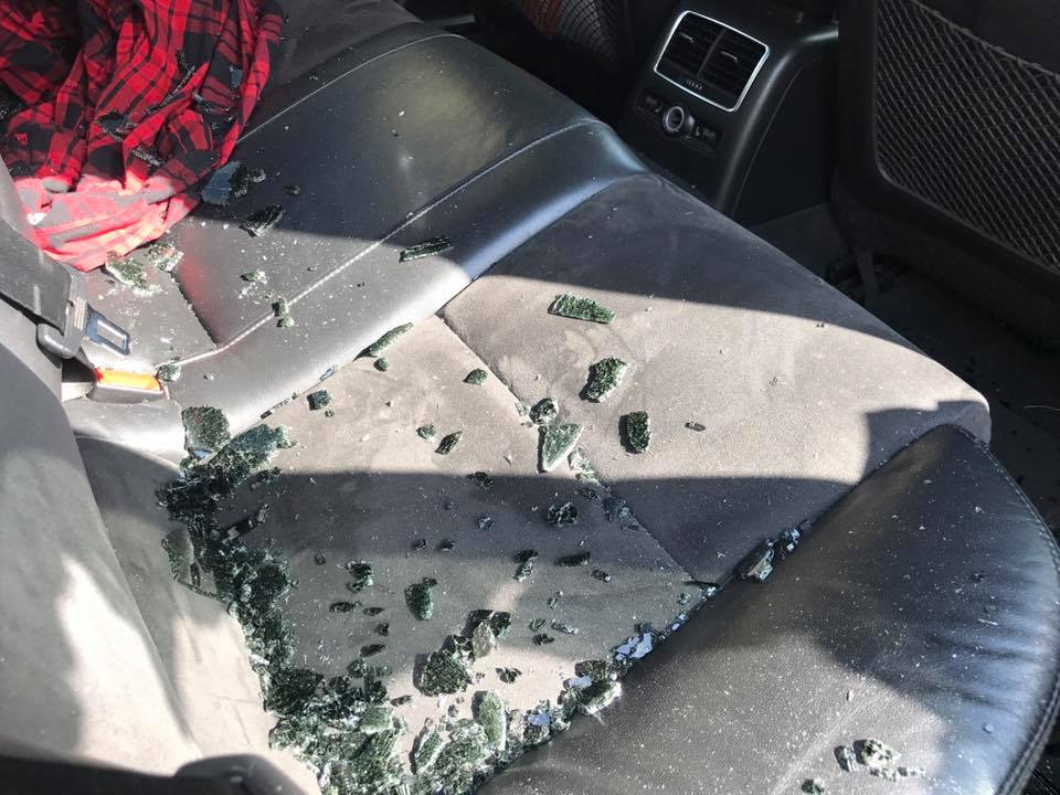 Булыжник остался лежать в салоне автомобиля. Также кресла были засыпаны разбитым стеклом.